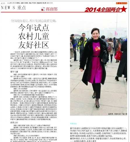 一如往年,全國政協(xié)委員、香江集團總裁翟美卿在全國兩會上繼續(xù)保持了對農(nóng)村留守兒童問題的關(guān)注。她今年的5個提案中,其中一個還是關(guān)于留守兒童,她在接受南都專訪時表示,“如果政府不參與、不牽頭,(農(nóng)村留守兒童)這個問題解決不了!